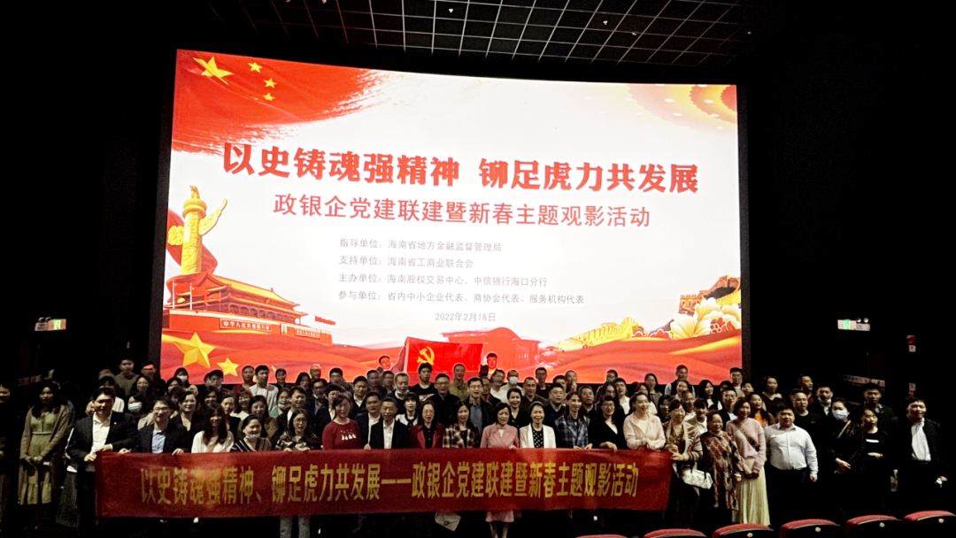為發揮黨建引領作用,加強政銀企溝通互動,近日,海南股交聯合中信銀行海口分行開展“以史鑄魂強精神、鉚足虎力共發展”政銀企黨建聯建暨新春主題觀影活動。此次活動得到了海南省地方金融監督管理局、海南省工商業聯...