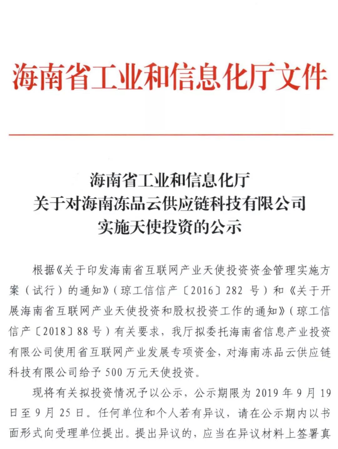 近期,海南省工業和信息化廳發布關于對海南股權交易中心掛牌企業海南凍品云供應鏈科技有限公司實施天使投資的公示,擬委托海南省信息產業投資有限公司使用省互聯網產業發展專項資金,對海南凍品云供應鏈科技有限公司...
