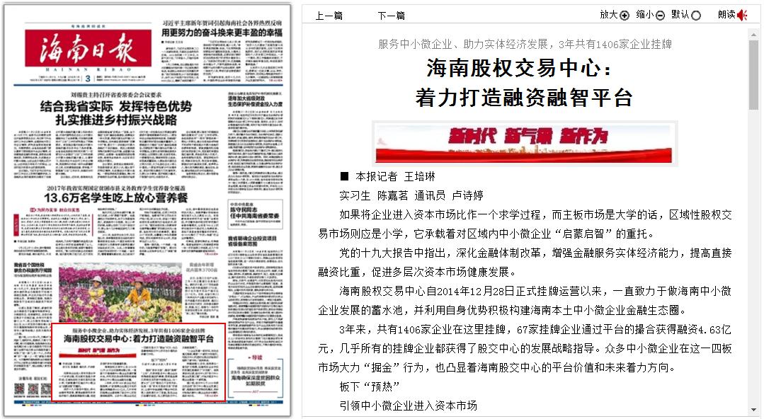 1月3日,海南日報頭版刊發報道——《海南股權交易中心:著力打造融資融智平臺》。報道回顧了股交中心成立三年來,在引領中小微企業進入資本市場、融資融智加速中小微企業發展、塑造中小微企業金融品牌等方面所走過的...