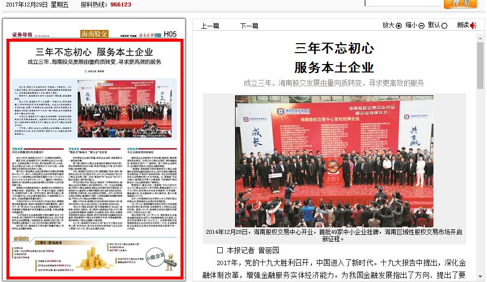 近日,證券導報以四個版面整版報道海南股權交易中心,關注股交中心三年以來的發展。其中,通過一個版面的篇幅,提煉總結了股交中心的亮點工作及服務企業、創新業務等方面的突破和股交中心三年以來取得的成績。報道指...