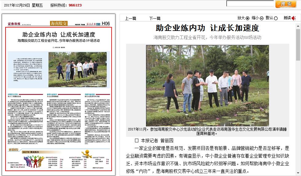 近日,證券導報以四個版面整版報道海南股權交易中心,關注股交中心三年以來的發展。其中,通過一個版面的篇幅,提煉總結了股交中心“助力中小微企業發展工程”啟動一年以來,在服務企業、推動企業發展等方面走過的歷...