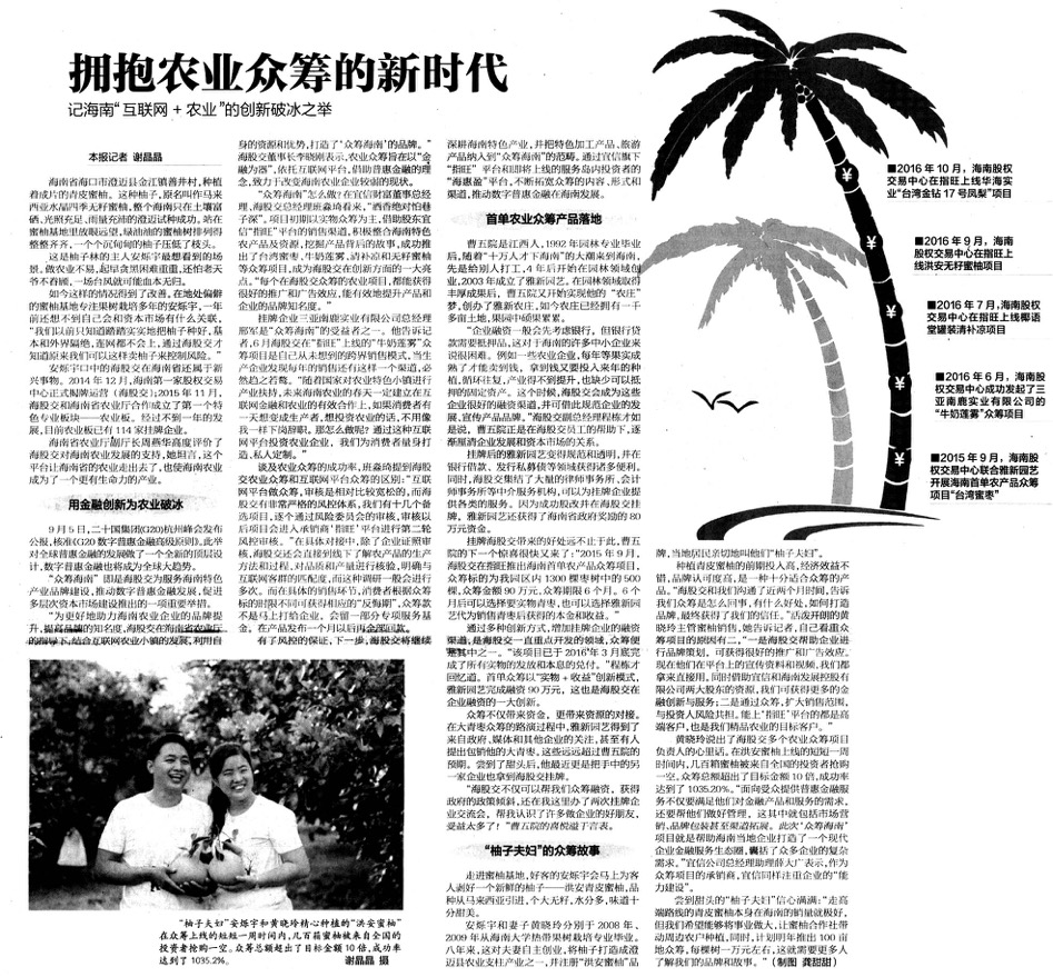 中國人民銀行唯一直屬刊物《金融時報》近整版報道了海南股權交易中心“眾籌海南”項目,文章以《擁抱農業眾籌的新時代 記海南“互聯網+農業”的創新破冰之舉》為題,圍繞數字普惠金融、“互聯網+農業”創新等內容展開。