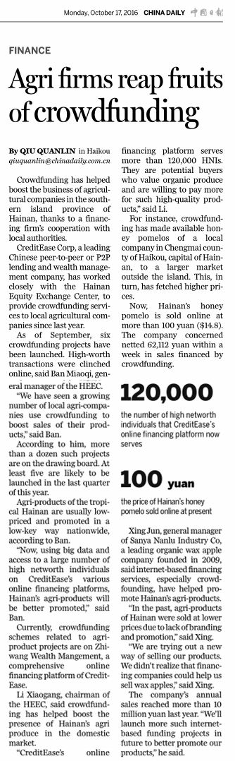 10月17日,國(guó)家英文日?qǐng)?bào)《China Daily》刊發(fā)文章《Agri firms reap fruits of crowdfunding》,對(duì)海南股權(quán)交易中心“眾籌海南”項(xiàng)目進(jìn)行了深入的報(bào)道。