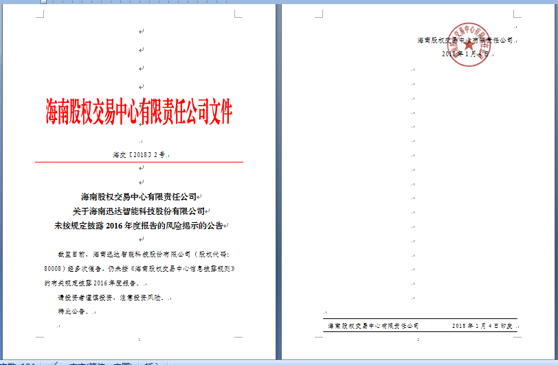 海南股權(quán)交易中心有限責(zé)任公司關(guān)于海南迅達(dá)智能科技股份有限公司未按規(guī)定披露2016年度報告的風(fēng)險揭示的公告