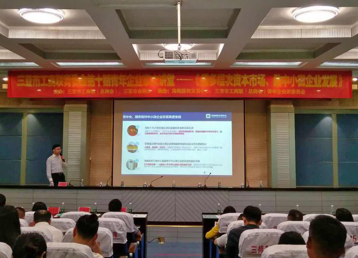 為了響應省政府貫徹落實國務院發展和完善多層次資本市場的號召,扶持十二大重點產業發展,構建三亞“一支柱兩支撐”發展思路,調整經濟結構,助力非公經濟發展,幫助三亞中小企業拓寬融資渠道,提升企業核心競爭力,3月20日下午,由三亞市政府金融辦和三亞市工商聯合會主辦,海南股權交易中心承辦的“借多層次資本市場、助中小微企業發展”培訓活動在三亞市委黨校報告廳成功舉辦。