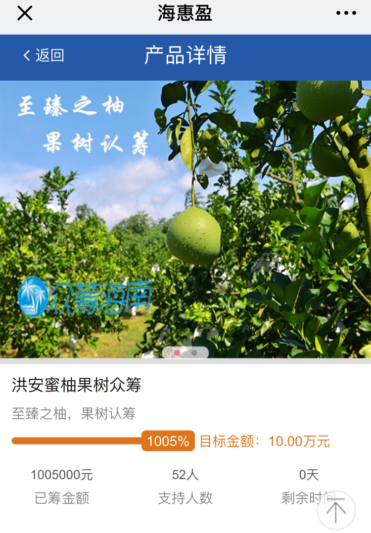 去年底,為了幫助企業(yè)解決短期資金流轉(zhuǎn)問(wèn)題,海南股權(quán)交易中心聯(lián)合掛牌企業(yè)澄邁洪安農(nóng)業(yè)開發(fā)有限公司發(fā)起了存續(xù)期為9個(gè)月的“洪安蜜柚果樹眾籌”項(xiàng)目,項(xiàng)目在股交中心綜合金融服務(wù)平臺(tái)“海惠盈”發(fā)布后短時(shí)間內(nèi)達(dá)成了募集資金目標(biāo),最終募集金額達(dá)100.5萬(wàn)元。