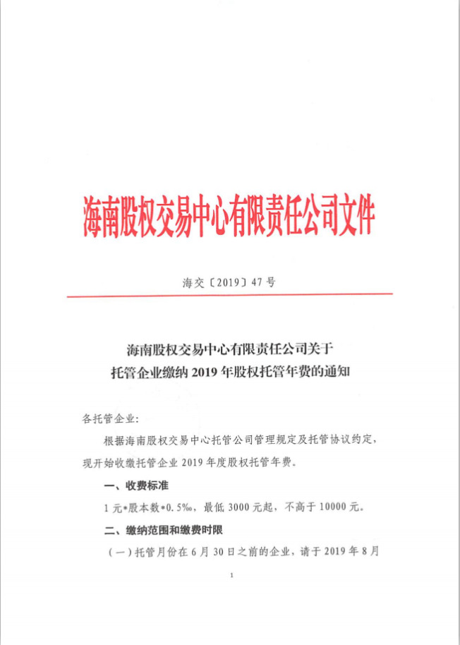 海南股權(quán)交易中心有限責(zé)任公司關(guān)于托管企業(yè)繳納2019年股權(quán)托管年費的通知