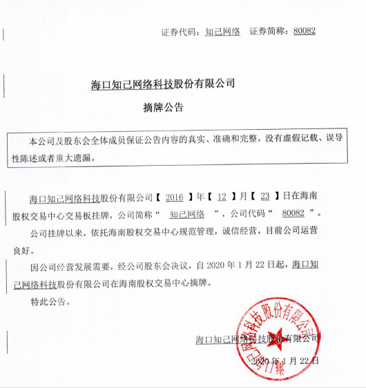 80082 海口知己網絡科技股份有限公司:摘牌公告