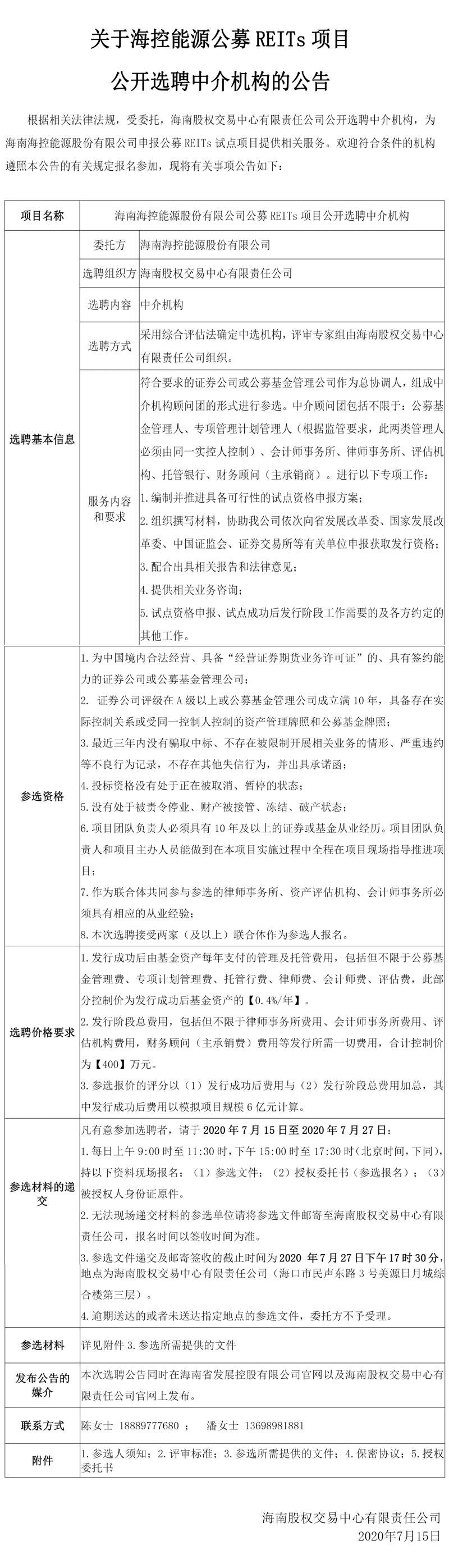 關于海控能源公募REITs項目公開選聘中介機構的公告