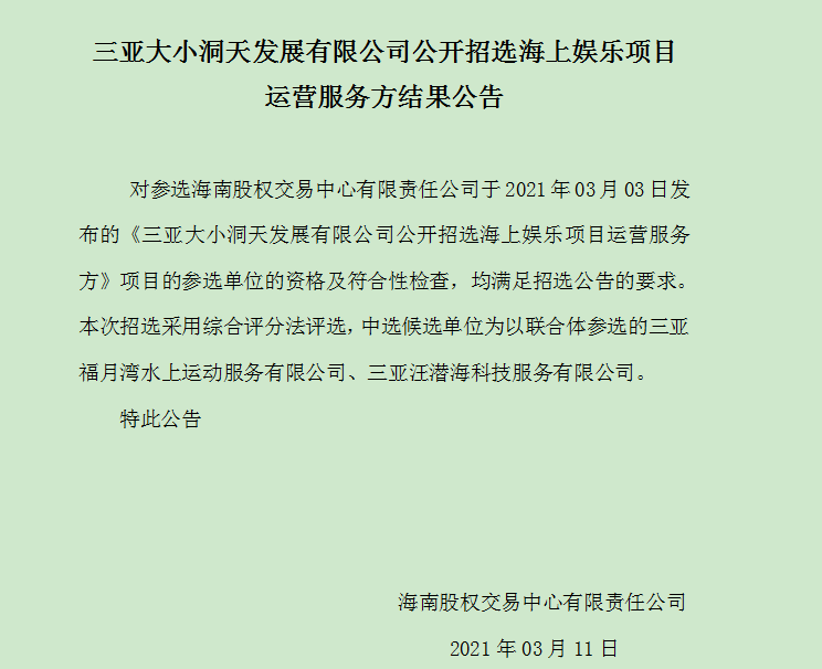 三亞大小洞天發展有限公司公開招選海上娛樂項目運營服務方結果公告