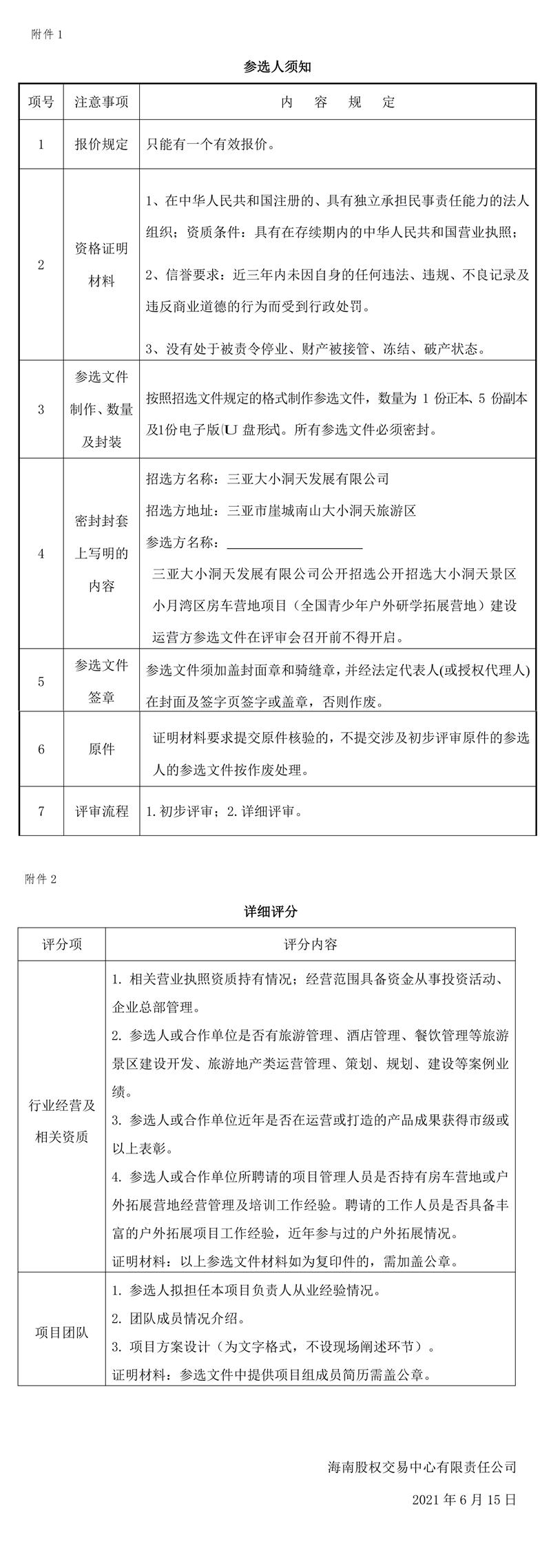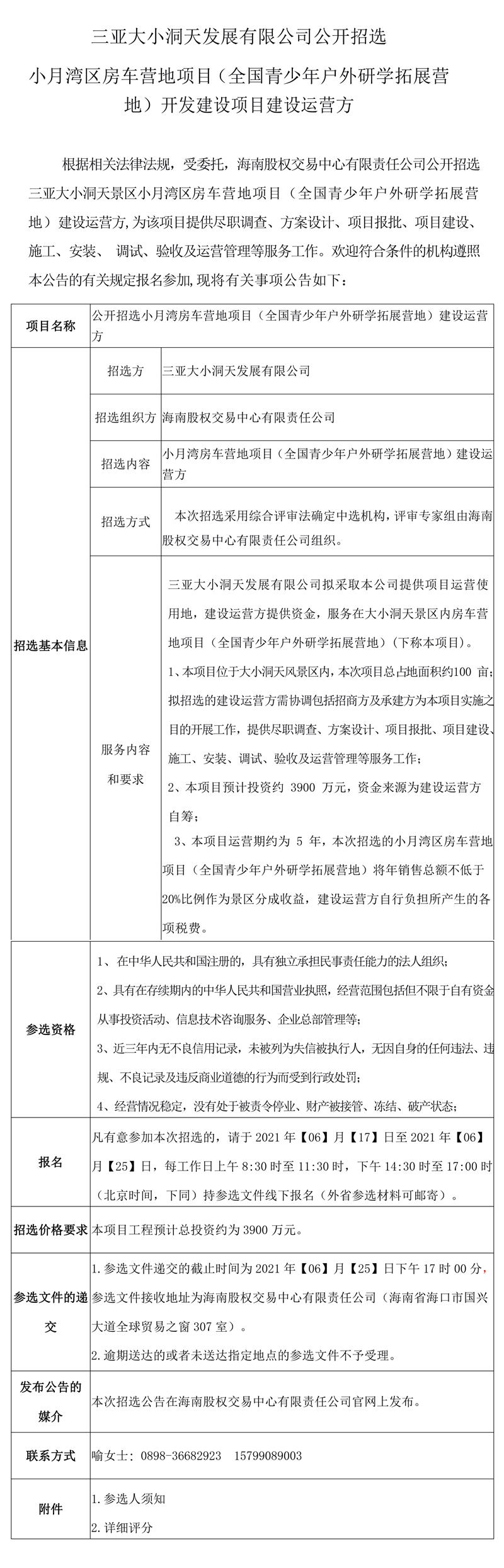 三亞大小洞天發(fā)展有限公司公開招選 小月灣區(qū)房車營(yíng)地項(xiàng)目(全國(guó)青少年戶外研學(xué)拓展?fàn)I地)開發(fā)建設(shè)項(xiàng)目建設(shè)運(yùn)營(yíng)方