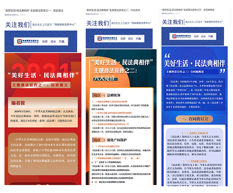 2021年7月7日-29日期間,海南股交通過(guò)邀請(qǐng)知名專家、投資機(jī)構(gòu)進(jìn)行線上授課和微信公眾號(hào)平臺(tái)轉(zhuǎn)發(fā)“民法典主題普法宣傳”等形式,開(kāi)展企業(yè)培育宣傳活動(dòng)。其中,線上課程向掛牌公司、展示企業(yè)、托管企業(yè)尤其是“專精特新”企業(yè)定向邀約,邀請(qǐng)企業(yè)代表參加《“商業(yè)計(jì)劃書”系列課程》兩堂線上直播課,直播課在線參與人數(shù)922名,活動(dòng)取得了良好效果。