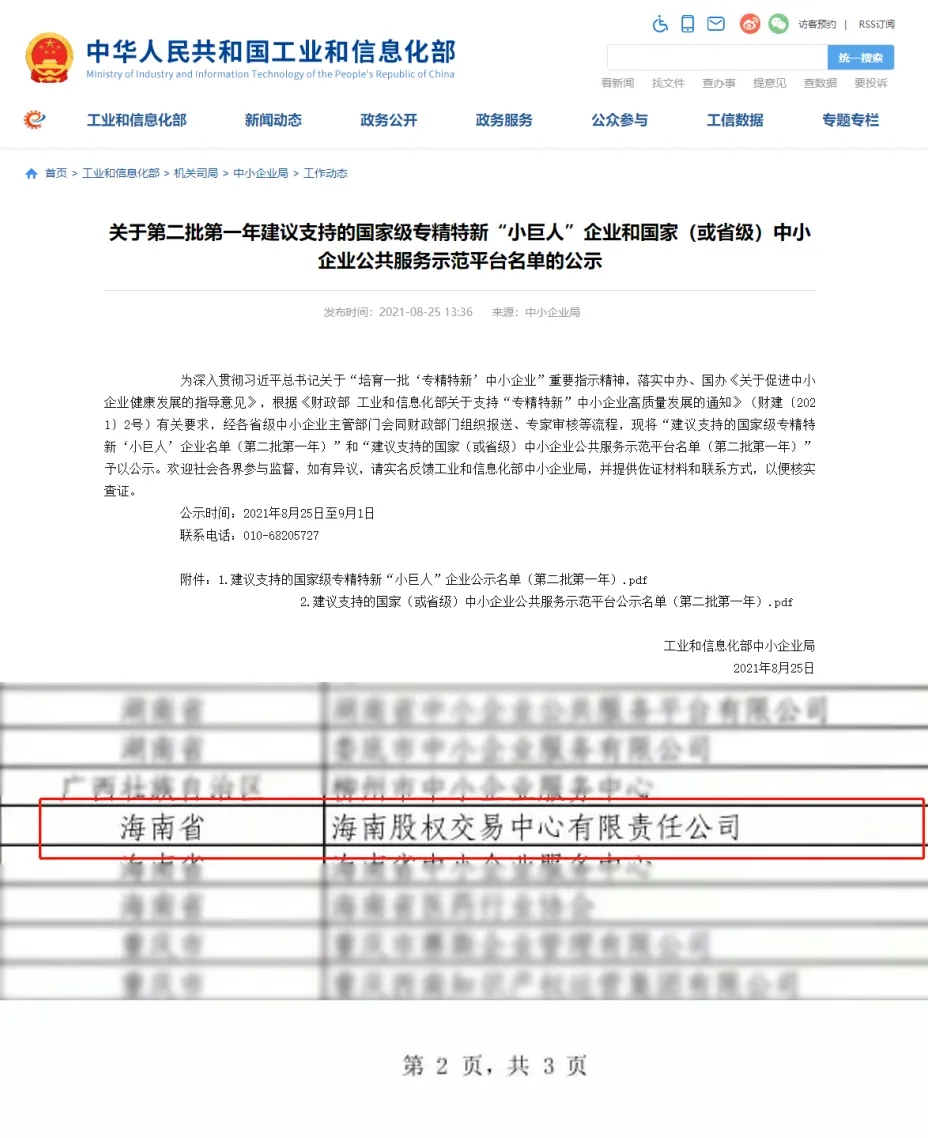 2021年8月,海南股交入選第二批“建議支持的國家(或省級)中小企業公共服務示范平臺”名單。證明了海南股交服務“專精特新”中小企業的能力獲得了工信部及省工信廳的認可。