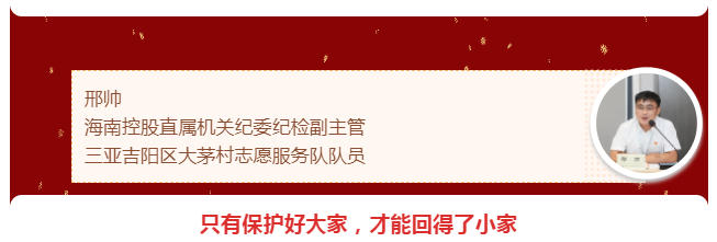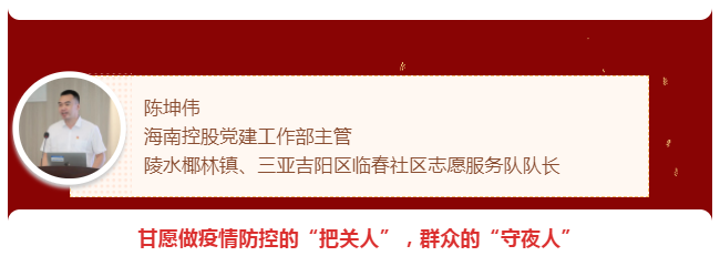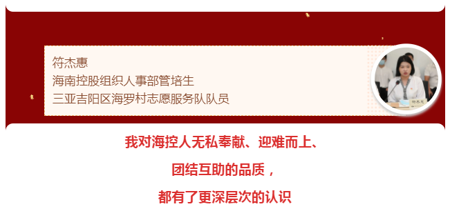 報名成為志愿者的那一刻,我沒有猶豫。公司最早派出的包括大茅村小隊等一批志愿者們辛勤工作的身影深深激勵著我。我媽媽是一名曾作為志愿者投身防疫工作的醫(yī)生,她的一言一行感召著我,最重要的是,作為黨員、作為海控大家庭中的一名新青年,此刻正是應該體現(xiàn)黨員擔當、海控擔當?shù)臅r刻,我也一定要以實際行動體現(xiàn)公司“服務海南”的宗旨。在三亞工作的每一天,每一位海控志愿者都在特殊環(huán)境下艱苦奮斗,在每一個任務、每一天工作中追求卓越,這段特殊的工作經(jīng)歷在我人生中留下了濃墨重彩的一筆,讓我對海控人無私奉獻、迎難而上的品質(zhì),與彼此關心友愛、互幫互助的團結(jié)都有了更深層次的認識。能夠在海控工作,我感到非常非常開心與驕傲!