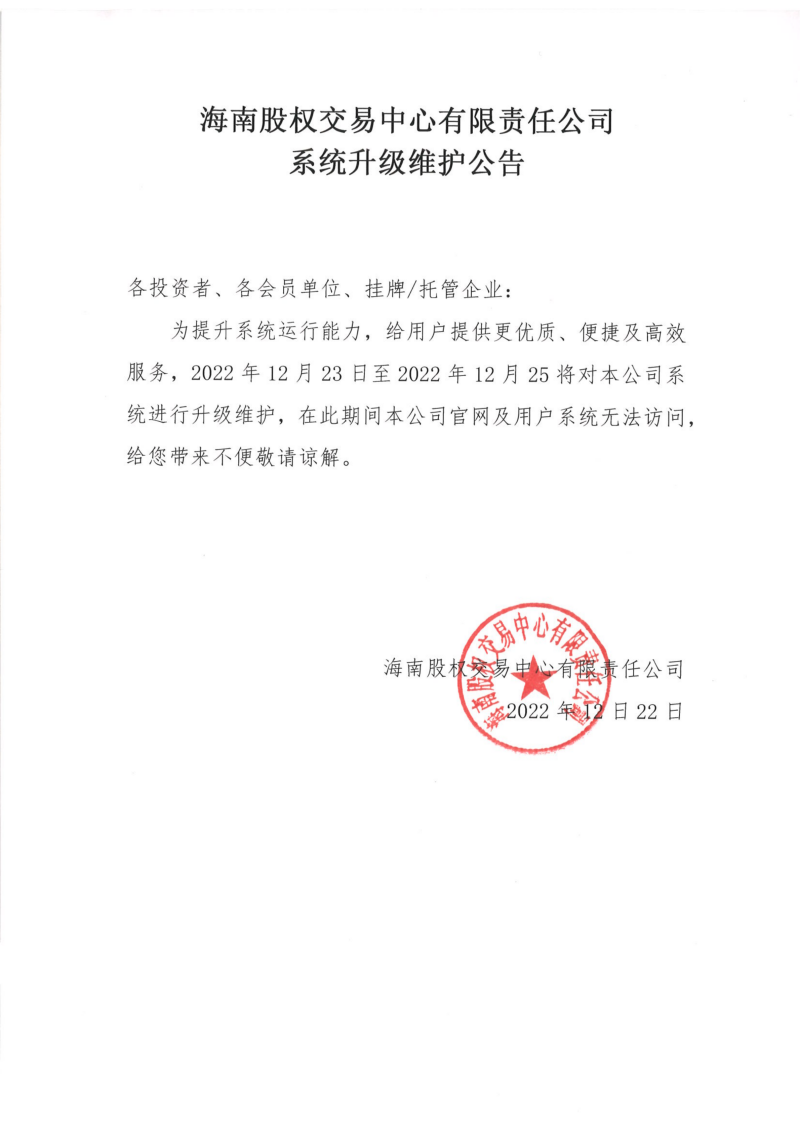 海南股權交易中心有限責任公司系統升級維護公告