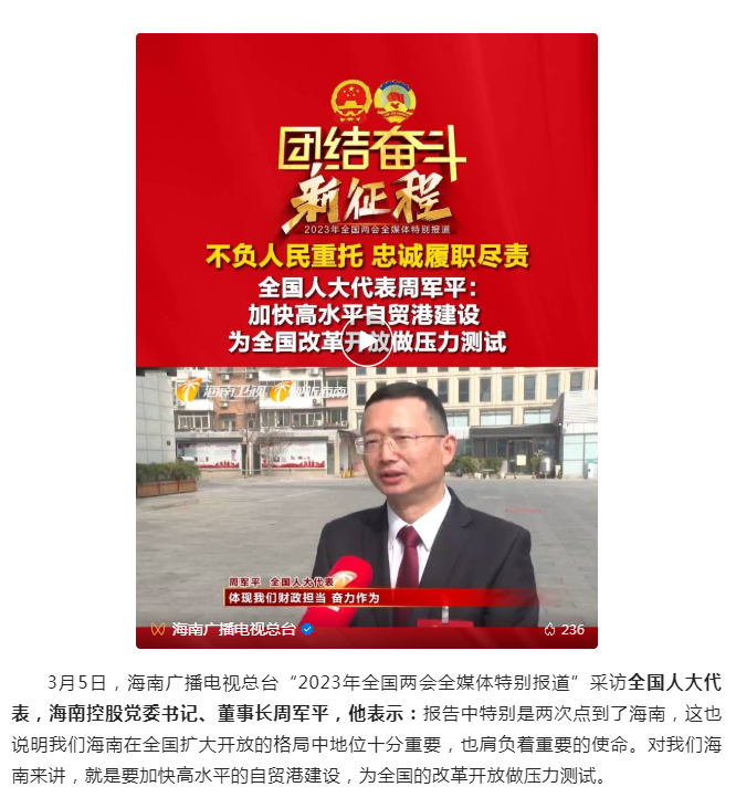 近日來,新華社、經濟參考報、海南日報、海南廣播電視總臺等多家媒體,先后采訪了全國人大代表、海南控股黨委書記、董事長周軍平,他圍繞高水平推動海南自貿港建設、恢復和擴大消費、全島封關運作“一號工程”等主題談體會、話發展。