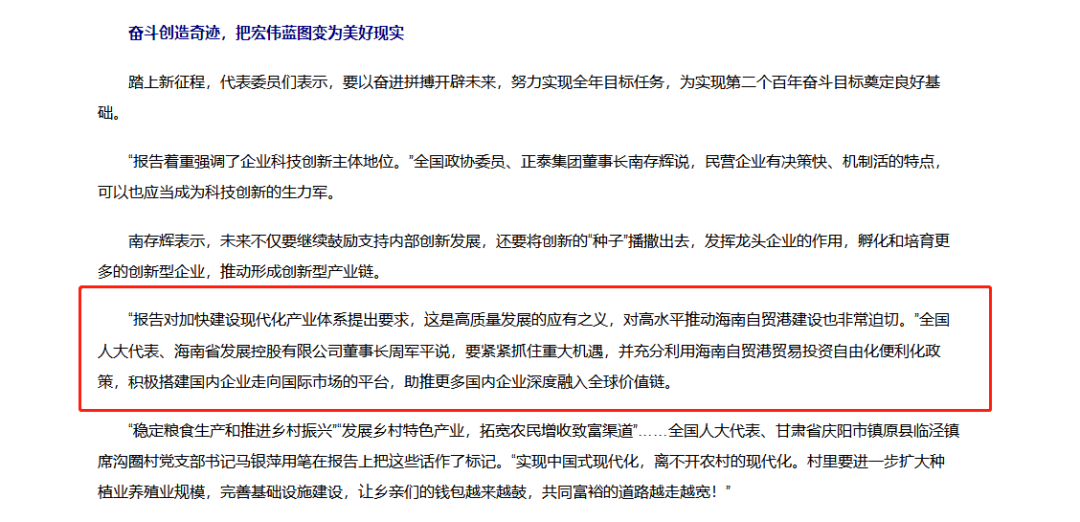 “報告對加快建設現代化產業體系提出要求,這是高質量發展的應有之義,對高水平推動海南自貿港建設也非常迫切。”全國人大代表、海南省發展控股有限公司董事長周軍平說,要緊緊抓住重大機遇,并充分利用海南自貿港貿易投資自由化便利化政策,積極搭建國內企業走向國際市場的平臺,助推更多國內企業深度融入全球價值鏈。