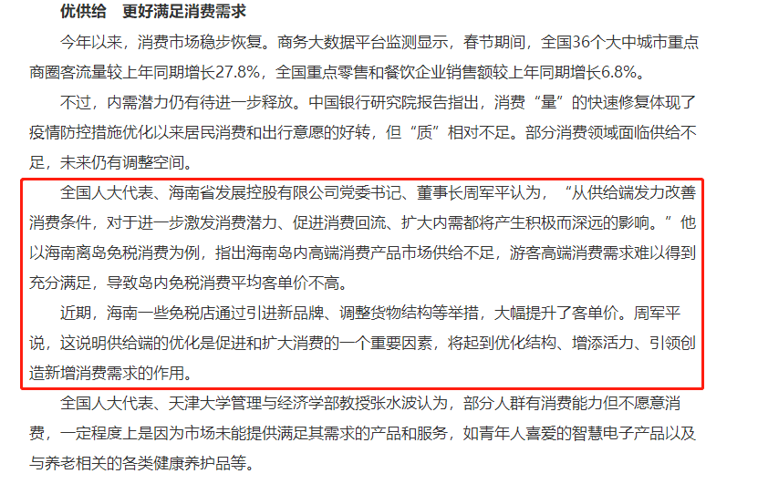 報道圍繞“如何讓消費‘熱’起來?怎樣解決不便消費、不愿消費、不敢消費等突出問題以釋放消費潛力?”采訪全國兩會代表委員。報道提及:全國人大代表、海南省發展控股有限公司黨委書記、董事長周軍平認為,“從供給端發力改善消費條件,對于進一步激發消費潛力、促進消費回流、擴大內需都將產生積極而深遠的影響。”他以海南離島免稅消費為例,指出海南島內高端消費產品市場供給不足,游客高端消費需求難以得到充分滿足,導致島內免稅消費平均客單價不高。近期,海南一些免稅店通過引進新品牌、調整貨物結構等舉措,大幅提升了客單價。周軍平說,這說明供給端的優化是促進和擴大消費的一個重要因素,將起到優化結構、增添活力、引領創造新增消費需求的作用。