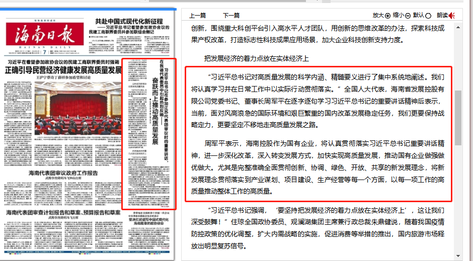 “習(xí)近平總書記對(duì)高質(zhì)量發(fā)展的科學(xué)內(nèi)涵、精髓要義進(jìn)行了集中系統(tǒng)地闡述。我們將認(rèn)真學(xué)習(xí)并在日常工作中以實(shí)際行動(dòng)貫徹落實(shí)。”全國(guó)人大代表,海南省發(fā)展控股有限公司黨委書記、董事長(zhǎng)周軍平在逐字逐句學(xué)習(xí)習(xí)近平總書記的重要講話精神后表示,當(dāng)前,面對(duì)風(fēng)高浪急的國(guó)際環(huán)境和艱巨繁重的國(guó)內(nèi)改革發(fā)展穩(wěn)定任務(wù),我們更要保持戰(zhàn)略定力,更要堅(jiān)定不移地走高質(zhì)量發(fā)展之路。