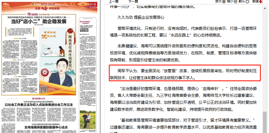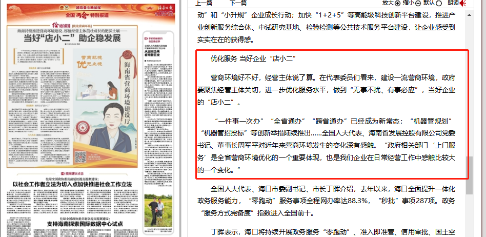 3月7日,海南日?qǐng)?bào)發(fā)布文章《當(dāng)好“店小二”助企穩(wěn)發(fā)展—— 海南持續(xù)推進(jìn)營(yíng)商環(huán)境建設(shè),厚植經(jīng)營(yíng)主體茁壯成長(zhǎng)的肥沃土壤》。文章指出:今年的政府工作報(bào)告在總結(jié)過(guò)去五年工作時(shí)提到,簡(jiǎn)政放權(quán)、放管結(jié)合、優(yōu)化服務(wù)改革不斷深化,營(yíng)商環(huán)境明顯改善。對(duì)此,出席全國(guó)兩會(huì)的我省代表委員們深有感觸。