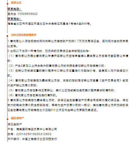 以上資產信息僅供參考,由轉讓方對資產的真實性、合法性、準確性負責,最終以資產權屬證明、合同、他項權證、法院判決書等有關資料為準。本轉讓信息不構成要約,具體以轉讓雙方后續簽署的相關協議為準。因簽訂或履行相關協議所產生的一切糾紛及法律后果等由轉讓雙方承擔,海南股交不承擔責任。