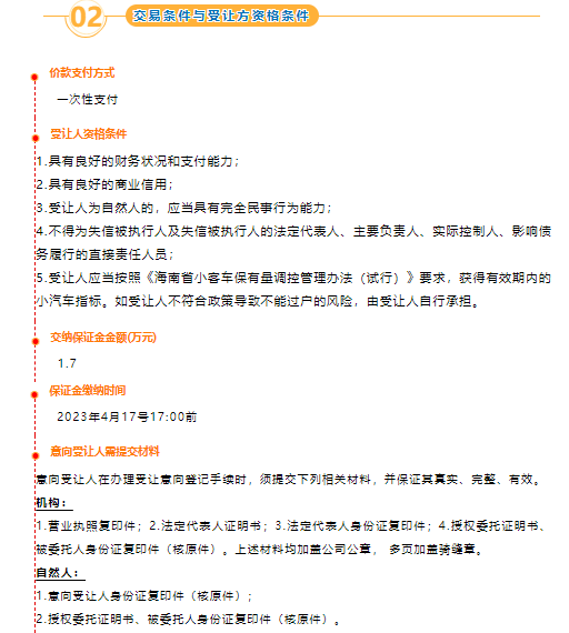 根據相關法律法規,受委托,海南股權交易中心有限責任公司公開披露以下資產轉讓信息,廣泛征集意向受讓方。特別提示:轉讓掛牌有效期滿,只產生一個符合條件的意向受讓人,采取協議轉讓方式成交;產生兩個(含)以上符合條件的意向受讓人,將采取競價方式成交。