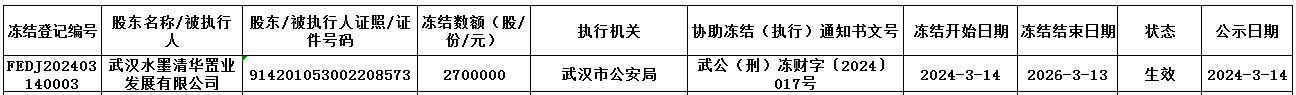依據(jù)武漢市公安局《協(xié)助凍結(jié)財(cái)產(chǎn)通知書》[武公(刑)凍財(cái)字〔2024〕017號(hào)]文件,我中心為海南瓊中長江村鎮(zhèn)銀行股份有限公司(企業(yè)代碼:893525)股東武漢水墨清華置業(yè)發(fā)展有限公司辦理股權(quán)凍結(jié)登記,具體情況如下: