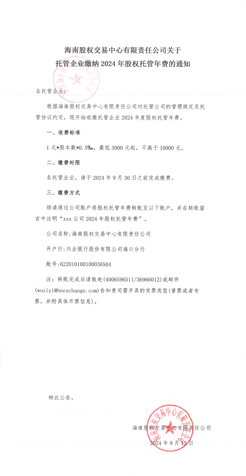 海南股權交易中心有限責任公司關于托管企業繳納2024年股權托管年費的通知