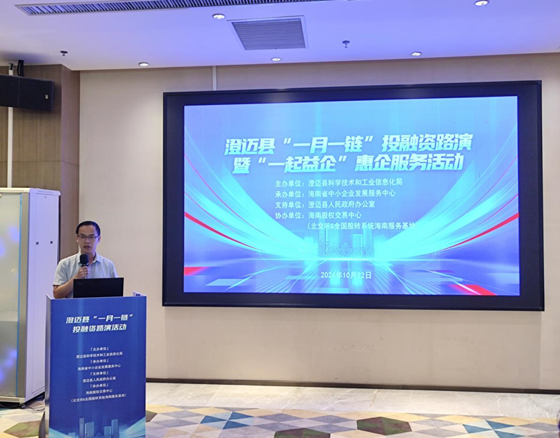 為進一步活躍澄邁縣投融資氛圍,實現企業與資本的高效聯合,10月22日,澄邁縣“一月一鏈”投融資路演暨“一起益企”惠企服務活動在老城科技新城成功舉辦。本次活動由澄邁縣科學技術和工業信息化局主辦、海南省中小企業發展服務中心承辦、澄邁縣人民政府辦公室支持、海南股權交易中心協辦,相關投融資機構以及中小企業代表等共計三十余人參加活動。