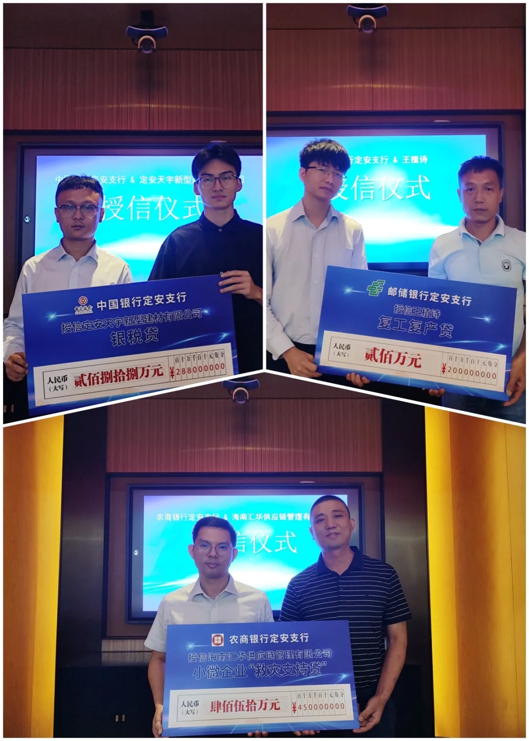 為幫助定安企業(yè)提供金融支持,中國銀行、中國建設銀行、中國農(nóng)業(yè)銀行、中國郵儲銀行、海南農(nóng)商行、海南銀行等金融機構分別介紹了各自專屬的金融產(chǎn)品和服務,并就救災貸、復工復產(chǎn)貸及開通融資綠色通道的申請條件、辦理流程、貸款額度、貸款期限、貸款利率和政府貼息等問題進行了詳細介紹。